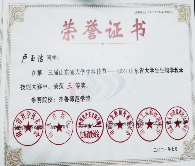 2021年7月,我院參賽人員經過激烈角逐層層篩選,脫穎而出捷報頻傳,在第十三屆山東省大學生科技節——山東省大學生生物學教學技能大賽中我院2018級生物科學專業何星晨獲一等獎、2018級生物科學專業盧玉潔、韓雨婷和周揚三人獲三等獎。