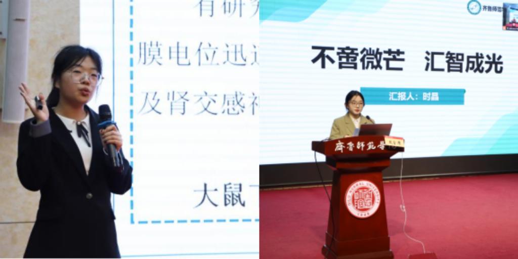 獲得第十八屆挑戰(zhàn)杯·建設(shè)銀行山東省大學(xué)生課外學(xué)術(shù)科技作品競(jìng)賽的團(tuán)隊(duì)成員張雅斐同學(xué)在現(xiàn)場(chǎng)向同學(xué)們還原了比賽路演與答辯的精彩過(guò)程。團(tuán)隊(duì)成員時(shí)晶同學(xué)以“不啻微芒,匯智成光”為主題,圍繞學(xué)院特色教育奠定參賽基礎(chǔ)、多元實(shí)踐積累賽事經(jīng)驗(yàn)、全員戮力備戰(zhàn)取得賽事成績(jī)?nèi)齻€(gè)方面分將參賽情況、參賽感悟、參賽經(jīng)驗(yàn)做了詳細(xì)的匯報(bào)分享。