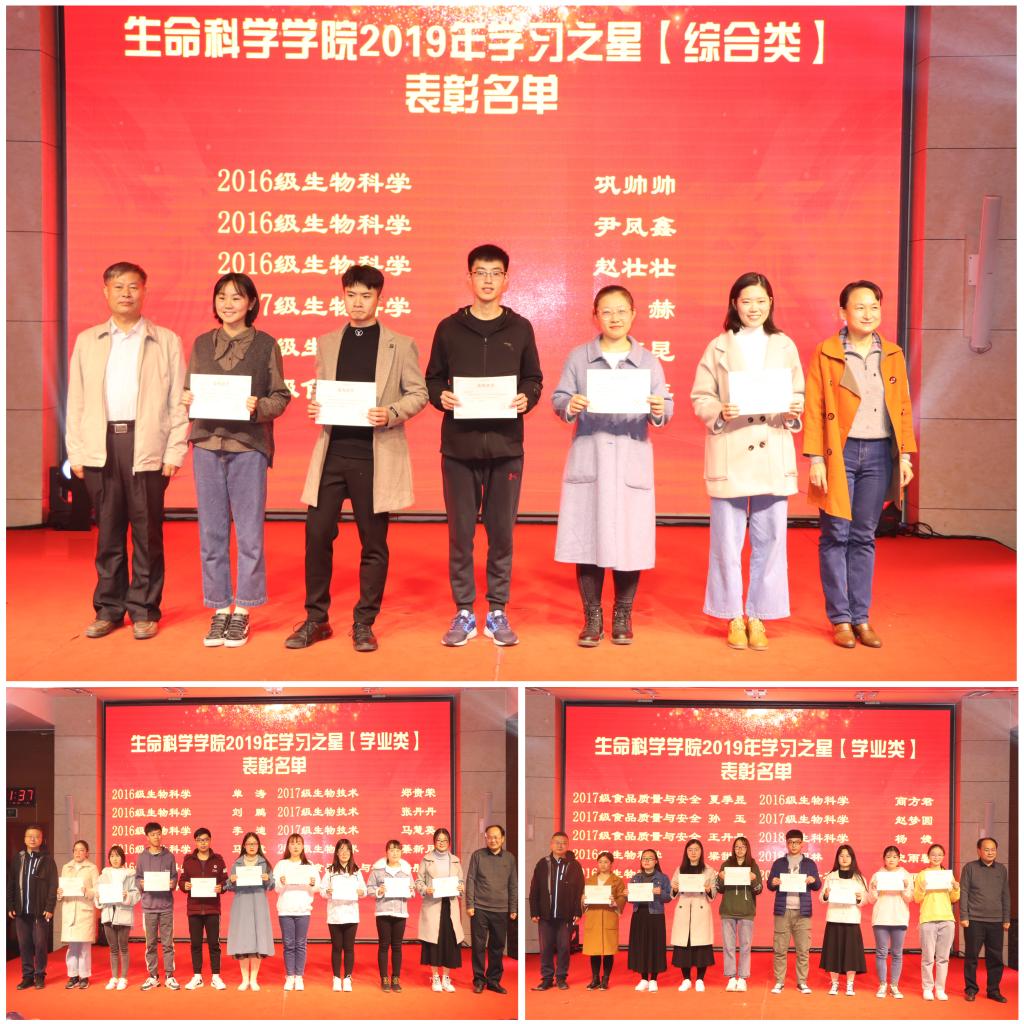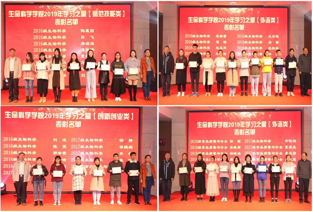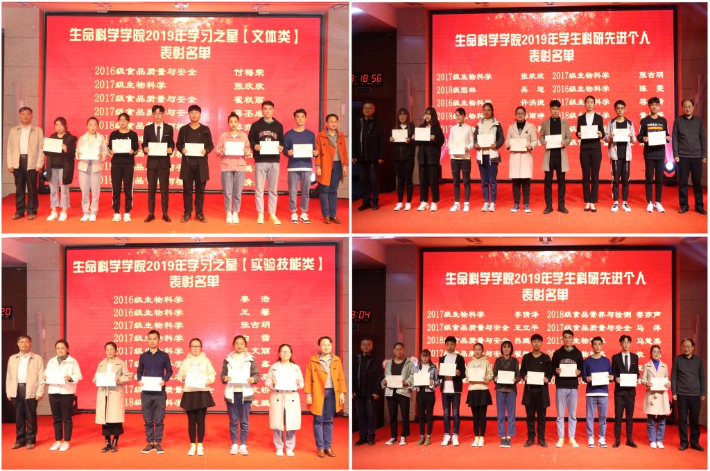 為表彰先進,弘揚正氣,樹立榜樣,凝聚力量,充分發揮先進典型的示范引領作用,晚會上,還隆重表彰了在科研、外語、學業、文體、創新創業等方面的先進學生,共有近百名學生獲得生命科學學院2018-2019學年度科研先進個人獎、學習之星【外語類】、學習之星【學業類】、學習之星【文體類】、學習之星【實驗技能類】、學習之星【師范技能類】、學習之星【創新創業類】、學習之星【綜合類】的光榮稱號并上臺領獎。