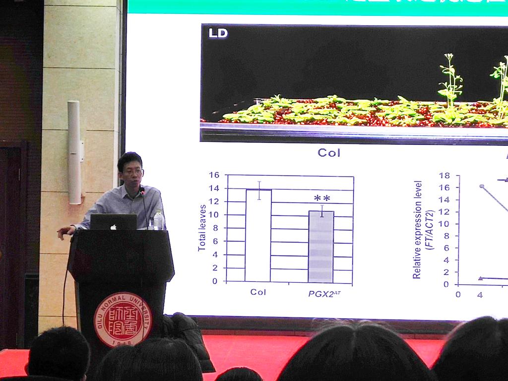 肖朝文研究員的研究方向包括植物細胞壁合成與降解的分子機制、植物細胞壁與細胞骨架的相互作用關系、細胞壁完整性對植物生長發育的調控機理等,在國際著名期刊Plant Cell、Plant Journal、Plant Physiology、Journal of Experimental Botany等發表多篇學術論文。在中,肖朝文研究員介紹了使用激活標簽法鑒定到兩個多聚半乳糖醛酸酶基因,并對兩個基因進行了功能分析。研究發現兩個基因都參與果膠降解、細胞壁修飾,進而影響細胞的伸長、下胚軸的伸長,并對花發育也有一定的調控作用。此外,肖朝文研究員介紹了半纖維素影響纖維素和微管的穩定性的研究結果:半纖維素木聚糖的缺失會導致微管排列更加規則、片段化,對機械壓力變得敏感,突變體的花莖變得彎曲。