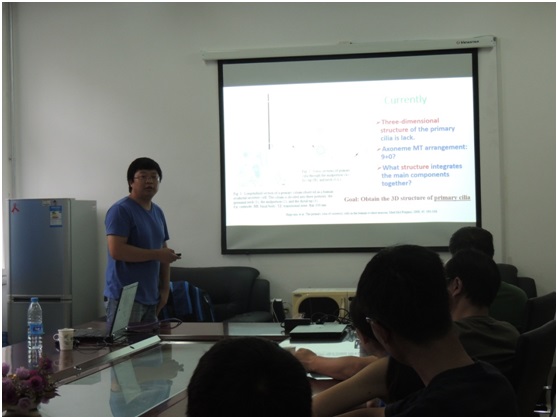 孫書鋒博士的研究領域為結構生物學。在題為“Three-dimensional structure of primary cilia in kidney cells”的報告中,孫博士詳細介紹了腎臟原纖毛的三維結構:9條微管在原纖毛基部往上伸展、并逐個到達各自的頂端,形成縱向上高低參次的形態,由此決定了原纖毛的直徑由基部到頂端逐漸變細,可能對維持原纖毛的穩固性起著重要作用。其研究結果可能形成對微管“9+2”或“9+0”模式的新的認知。此外,孫博士還分享了在樣本制備、電鏡掃描、計算等過程中出現的問題及解決方案。孫書鋒博士的報告深入淺出、條理清晰,并提供了自身的研究歷程、研究心得,在座的老師和同學們都受益匪淺。最后老師和同學們對報告中的疑問進行了提問,大家展開了深入的討論。