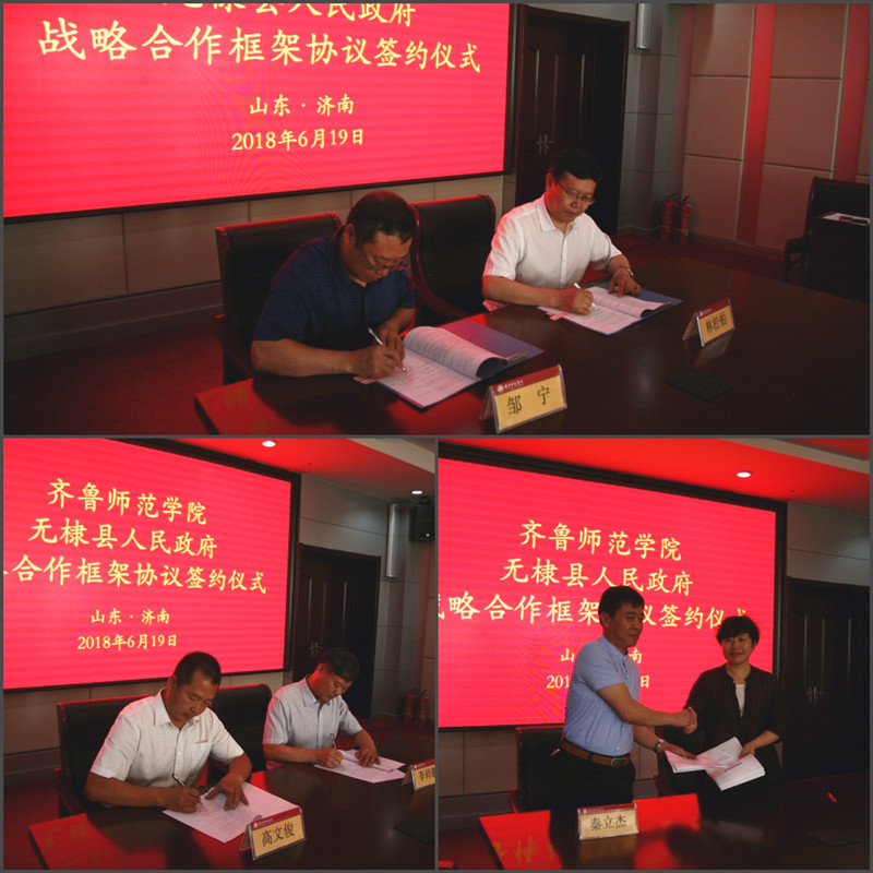 6月19日上午,我校與無棣縣人民政府戰略合作框架協議簽約儀式在我校章丘校區隆重舉行。無棣縣科技副縣長鄒寧、科學技術局局長邢呈軍、小泊頭鎮鎮長劉洪權、科學技術局副局長任志東、中醫院副院長喬宗星、小泊頭鎮產業辦副主任、有關企業負責同志、我校校長林松柏、校長辦公室主任牟偉、黨委宣傳部部長孔嵩峰、科研處處長(合作發展辦公室主任)魏培海、教師教育學院院長趙延銀、化學與化工學院院長曹曉榮、生命科學學院院長李師鵬、物理與電子工程學院副院長姬長建、信息科學與工程學院副院長李偉及部分教師代表出席了簽約儀式。簽約雙方齊聚一堂,共同見證了本次簽約。簽約儀式由魏培海主持。