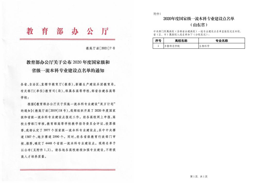 教育部于2019年4月啟動了一流本科專業建設“雙萬計劃”,2019年至2021年建設1萬個左右國家級一流本科專業點和1萬個左右省級一流本科專業點。我院生物科學(師范)專業繼2019年入選山東省一流專業后,2020年成功獲批國家級一流本科專業建設點。