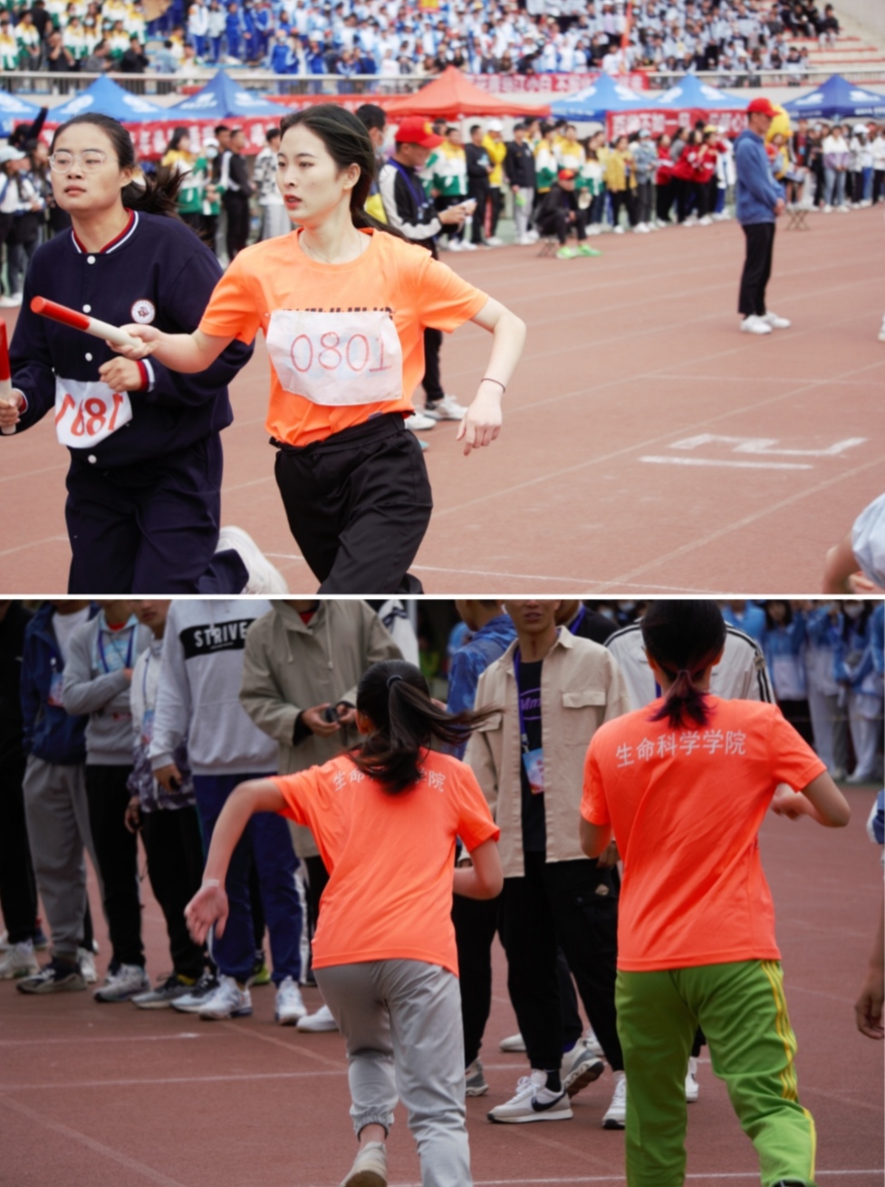 生命科學學院運動員以跑道為“馬”,以運動鞋為“鞍”,目標堅定,一棒接一棒向終點進發。伴隨一聲槍響,比賽正式開始,整個賽場鑼鼓齊鳴、氣氛熱烈,身著印有“生命科學學院”字樣橙紅色運動服運動員一棒接著一棒,每一棒運動員都穩居第一,充分展現出生科學子積極奮進的精神狀態。他們像一支支離弦之箭,奮力向前沖去,他們自愛操場上揮灑者汗水,釋放著青春的激情和活力,更像是一個個義無反顧的戰士,為團隊而戰,為集體而戰。一副副拼搏向上的畫面,一個個激動人心的鏡頭,至第15棒李聰慧交接結束時后,生科院16號運動員謝昊霖蓄勢待發、奮力起跑。賽場上,僅有生科一名男運動員在奔跑,繼續把原有的優勢擴大至最大化,充分展現出生科速度、生科魄力。“生科加油,生科加油,……”觀眾席上身著綠色院服的生科學子們的吶喊聲震人心脾,激勵著賽場上的“戰士們”,愈戰愈勇,場上場下休戚與共,團結一心,賽事近況,更是扣人心弦,此時此刻每位生科學子的吶喊聲都包含著說不出的激動與自豪,同時也真正感受到生命科學學院無上的歸屬感。