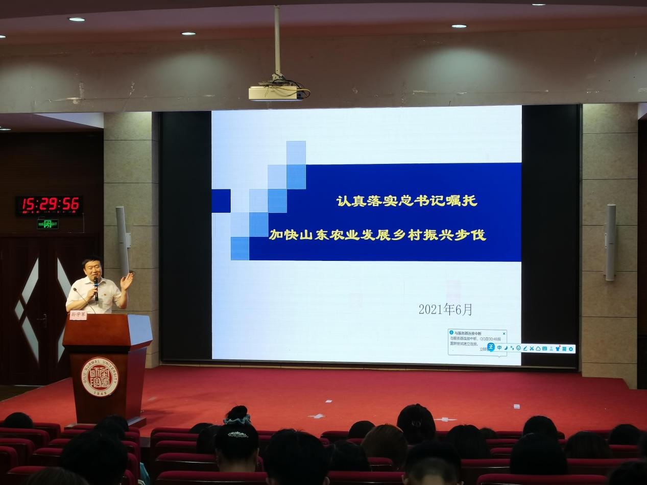 孫學軍在我校學術報告廳作了《認真落實總書記囑托加快山東農業發展鄉村振興步伐》的專題報告。從山東省現代農業發展現狀、推進農業農村經濟工作的總體思路和重點任務、當前農業農村經濟發展的形勢任務三個方面展開報告,系統闡述了山東省現代農業在生產、產能、加工以及市場上的發展現狀;深刻闡明了山東省現代農業今后發展的三大亮點:一是建“三區”“三園”加“一體”,二是大規模實施農業節水,三是扶持鄉村工匠,旨在加快推進農業和農村現代化。