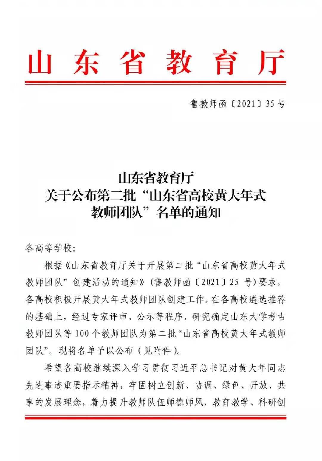 近日,《山東省教育廳關于公布第二批“山東省高校黃大年式教師團隊”名單的通知》(魯教師函[2021]35號)正式公布了第二批“山東省高校黃大年式教師團隊”名單,我院植物生物學教師團隊榮獲第二批“山東省高校黃大年式教師團隊”稱號。
