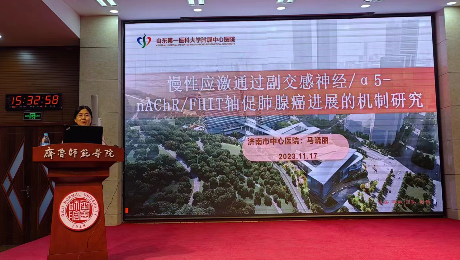 11月17日下午,應生命科學學院邀請,山東第一醫科大學附屬中心醫院基礎醫學研究中心主任、博士生導師馬曉麗教授來我校進行了交流訪問。馬曉麗教授在第一報告廳為師生做了一場題為“慢性應激通過副交感神經/α5-nAChR/FHIT軸促肺腺癌進展的機制研究”的學術講座。講座由院長崔大勇教授主持,生物科學與生物信息學等專業的學生聆聽了講座。