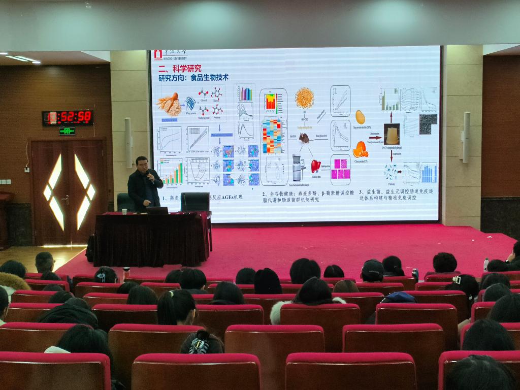 劉連亮重點圍繞全谷物成分,深入探討了燕麥酚類化合物(OPC)和燕麥β-葡聚糖(OBG)對代謝綜合征和腸道菌群的調控作用。通過其團隊的研究成果,對OPC和/或OBG在調節血清和肝臟脂質水平、調節腸道菌群結構表型和抑制美拉德反應AGEs的生成等方面的調控機制進行詳細介紹,為全谷物膳食預防高脂血癥等代謝綜合征提供解釋和支撐,也為燕麥酚類化合物抑制糖基化提供基礎。報告后,劉教授分享了自己的科研經歷,與師生進行了深入交流,并耐心解答了大家的問題。