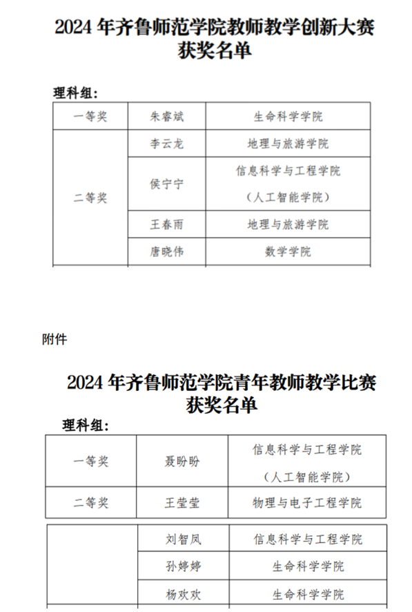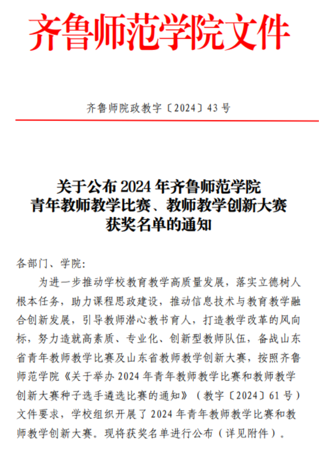 其中朱睿斌榮獲齊魯師范學院教師教學創(chuàng)新大賽理科組一等獎,孫婷婷、楊歡歡榮獲青年教師教學比賽理科組二等獎,并入選齊魯師范學院青年教師教學比賽和教師教學創(chuàng)新大賽種子選手名單。
