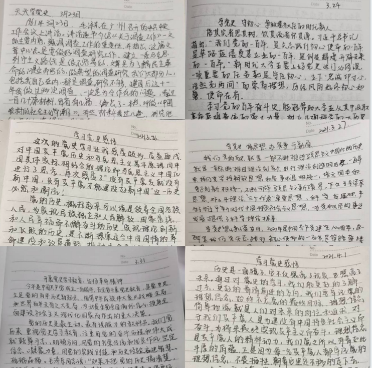 學生黨支部組織全體黨員認真進行黨史學習。4月8日,學生黨支部全體黨員于1號實驗樓B116會議室集體學習《中國共產黨簡史》,會議播放了《中國共產黨簡史》的有聲書音頻,學生黨支部全體成員重點研讀了《中國共產黨簡史》第一章“中國共產黨的創建和投身大革命的洪流”,各位黨員分別就學習感悟做了交流分享。除會上進行集中學習研討外,學生黨員平時認真按照黨支部的要求進行各種形式的自學,并記錄了學習筆記。