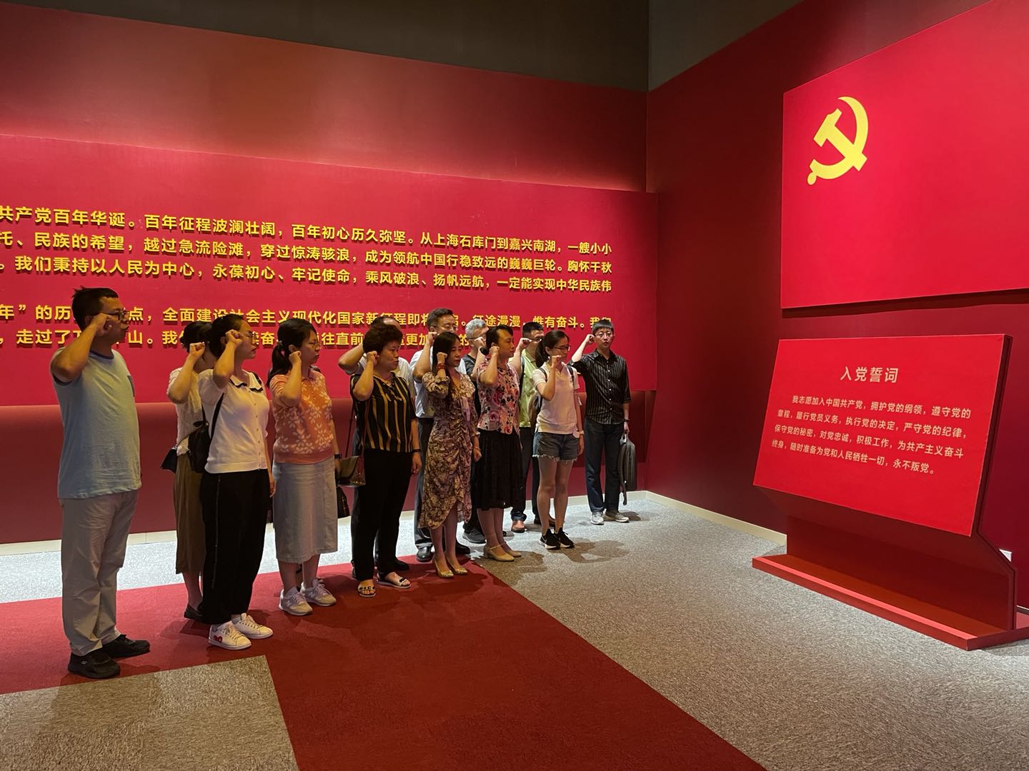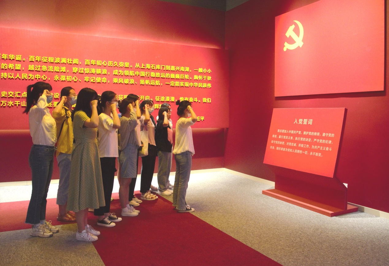 參觀結束后,生命科學學院全體師生黨員面向黨旗,緊握右拳,重溫入黨誓詞,莊重的氣氛迅速蔓延,鏗鏘有力的宣誓聲響徹大廳。