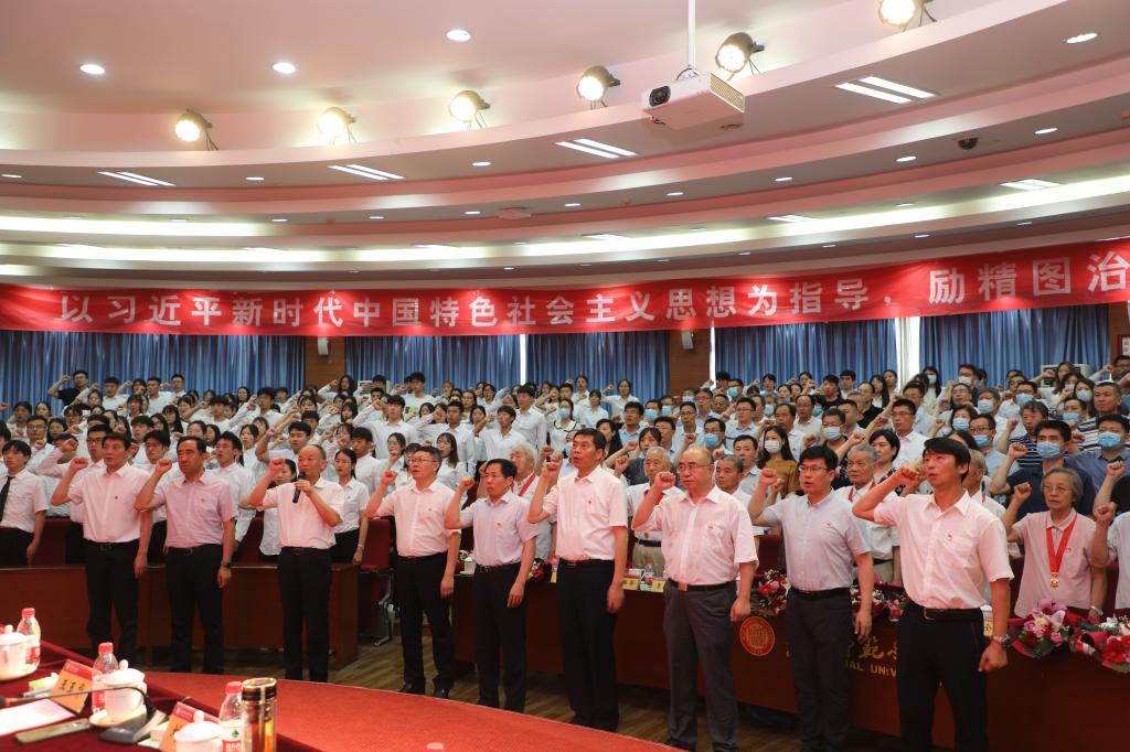 會議在全體人員齊聲高唱中華人民共和國國歌聲中拉開帷幕。接著,現場舉行了新黨員代表宣誓和老黨員重溫入黨誓詞儀式。在學校黨委書記王玉華帶領下,全體黨員舉起右拳,向黨旗莊嚴宣誓。宣誓全過程莊嚴肅穆,鏗鏘誓言在學術報告廳久久回蕩。