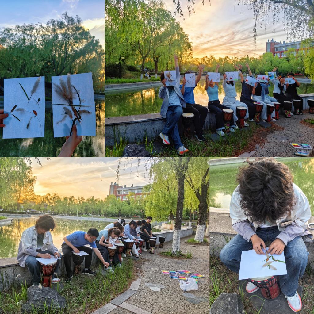 活動通過非洲鼓的原生態(tài)節(jié)奏與自然音效交織,學生們在敲擊與彈奏中感受生命的律動。活動中,學生們錄制風聲、水流聲等自然聲音,創(chuàng)作出獨特的“自然交響曲”。通過音樂即興表達情緒,有的用急促鼓點釋放焦慮,有的用舒緩旋律傳遞平靜。一位同學感嘆:“原來自然的聲音如此治愈,音樂讓我敢于直面內(nèi)心的煩惱。”