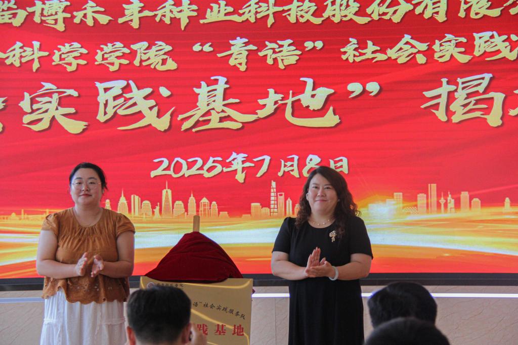 為深入學習貫徹黨的二十大關于鄉村振興的戰略部署,激勵青年學子培育為農情懷,提升助農本領,7月6日,齊魯師范學院生命科學學院“青語”社會實踐服務隊在指導老師黃玫的帶領下,赴淄博市臨淄區朱臺鎮開啟了科技助農社會實踐活動。其間,淄博市臨淄區團委副書記宋炳舒、農業局副局長朱建軍、人社局黨組成員、副局長徐文濤、朱臺鎮黨委副書記楊洋赴駐地看望社會實踐服務隊隊員,并與學院黨委書記張海龍、院長崔大勇、黨委副書記萬麗麗在淄博禾豐種業科技股份有限公司舉辦了大學生社會實踐基地揭牌儀式。淄博禾豐種業科技股份有限公司董事長朱俊科參加了儀式。