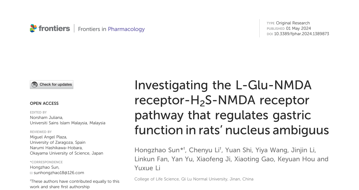 5月1日,重點實驗室主任孫洪兆教授作為第一作者和通訊作者,齊魯師范學院作為第一單位的論文《Investigating the L-Glu-NMDA receptor-H2S-NMDA receptor pathway that regulates gastric function in rats'nucleus ambiguus》在中科院2區期刊Frontiers in Pharmacology上發表。孫洪兆教授所指導研究生李宸宇同學作為共同第一作者,參與并完成該項目研究。
