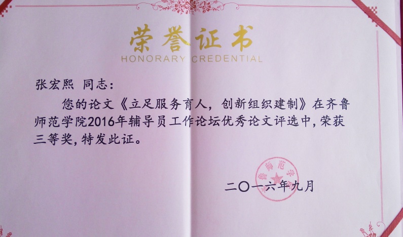 我院團(tuán)總支書記張幟、輔導(dǎo)員張宏熙兩位老師撰寫的論文在學(xué)校2016年輔導(dǎo)員工作論壇優(yōu)秀論文評(píng)選中分獲一等獎(jiǎng)和三等獎(jiǎng)。
