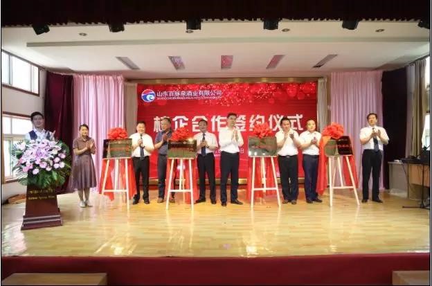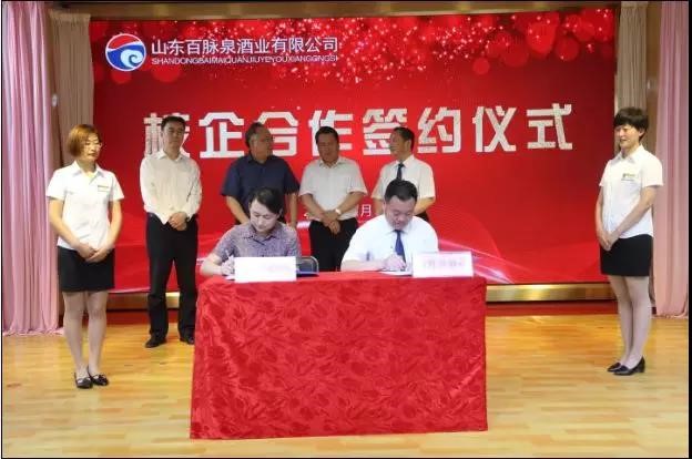 為推進產學研合作教育,更好地服務于區域經濟發展,充分借助雙方優勢,踐行“工學結合、校企合作”的應用型人才培養之路,2018年5月18日,我院與山東百脈泉酒業有限公司舉行校企合作簽約儀式,建立合作關系。我院姜東菲書記、崔大勇教授與其他三所高校一起出席此次活動。姜書記在在簽約儀式上發表講話,高度贊賞了百脈泉酒業“先做人,再做酒,做好人,做好酒”的企業理念,介紹了我院的辦學特色、教科研優勢和學科專業,希望今后同百脈泉酒業緊密合作,優勢互補,深度融合,以形成互惠、雙贏的長效機制。最后姜書記代表院方,與公司總經理馬業準簽約,并共同為實踐教學就業基地揭牌。